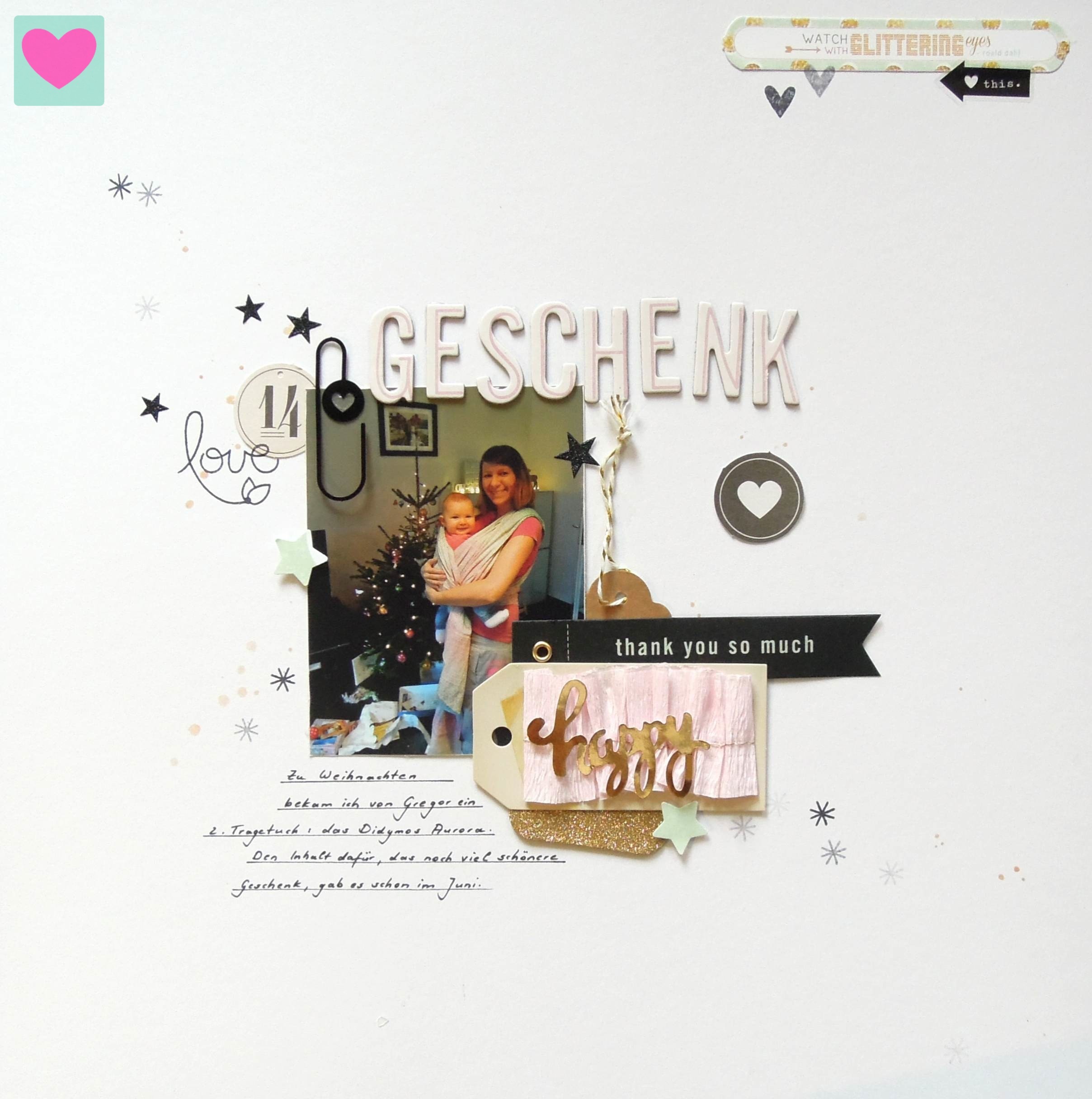 An Neujahr habe ich in meinem Lieblingsforum bei Komm Spielen #354 mit gemacht. Das Thema war „Mein schönstes Geschenk“. Ich habe mein schönstes Weihnachtsgeschenk und mein schönsten Geschenk 2014 in einem Layout verscrappt und das ist dabei raus gekommen.