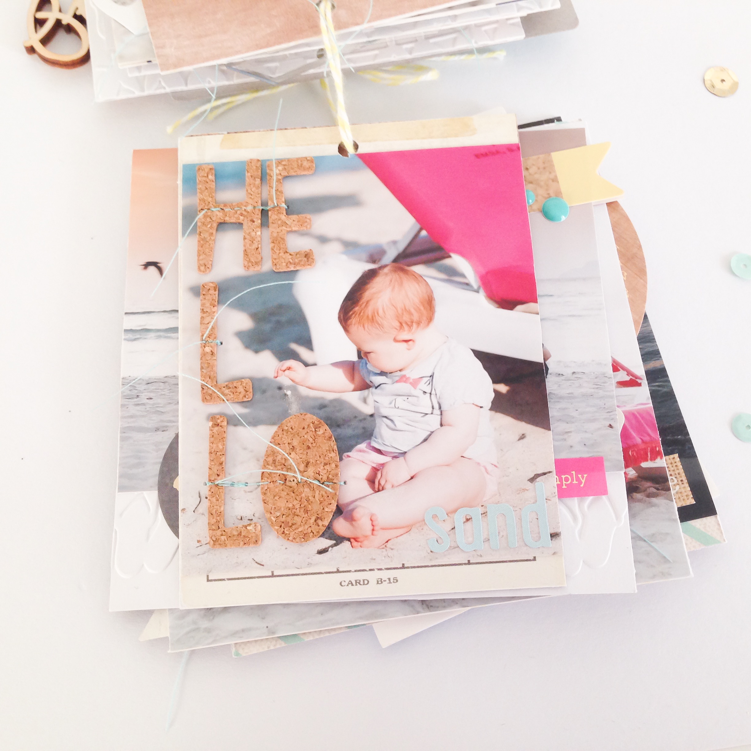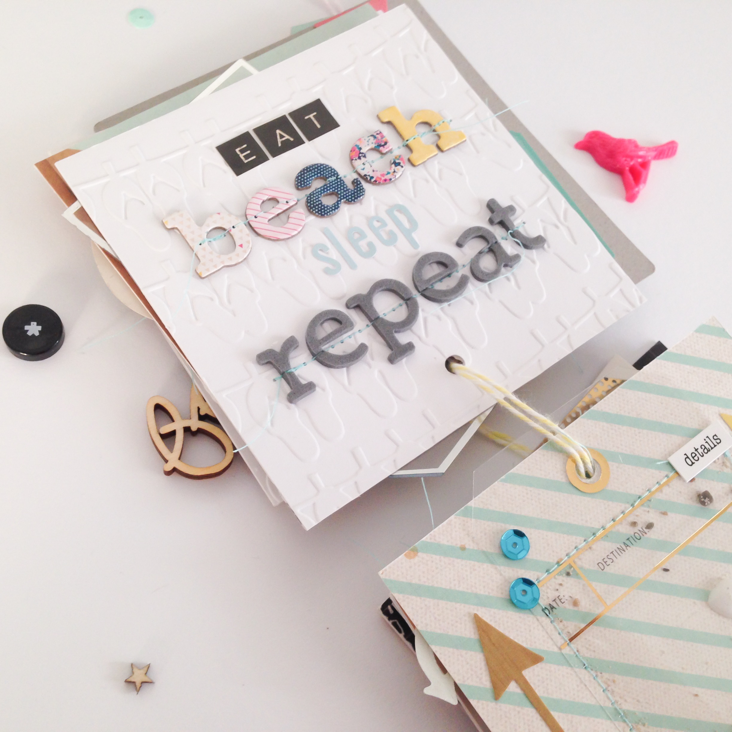 Den weissen Cardstock habe ich mit dem Echo Park Flip Flop Embossingfolder embosst. Den aus dem Urlaub mit gebrachten Sand und ein paar Mini Muscheln habe ich unter einem Tag eingenäht.