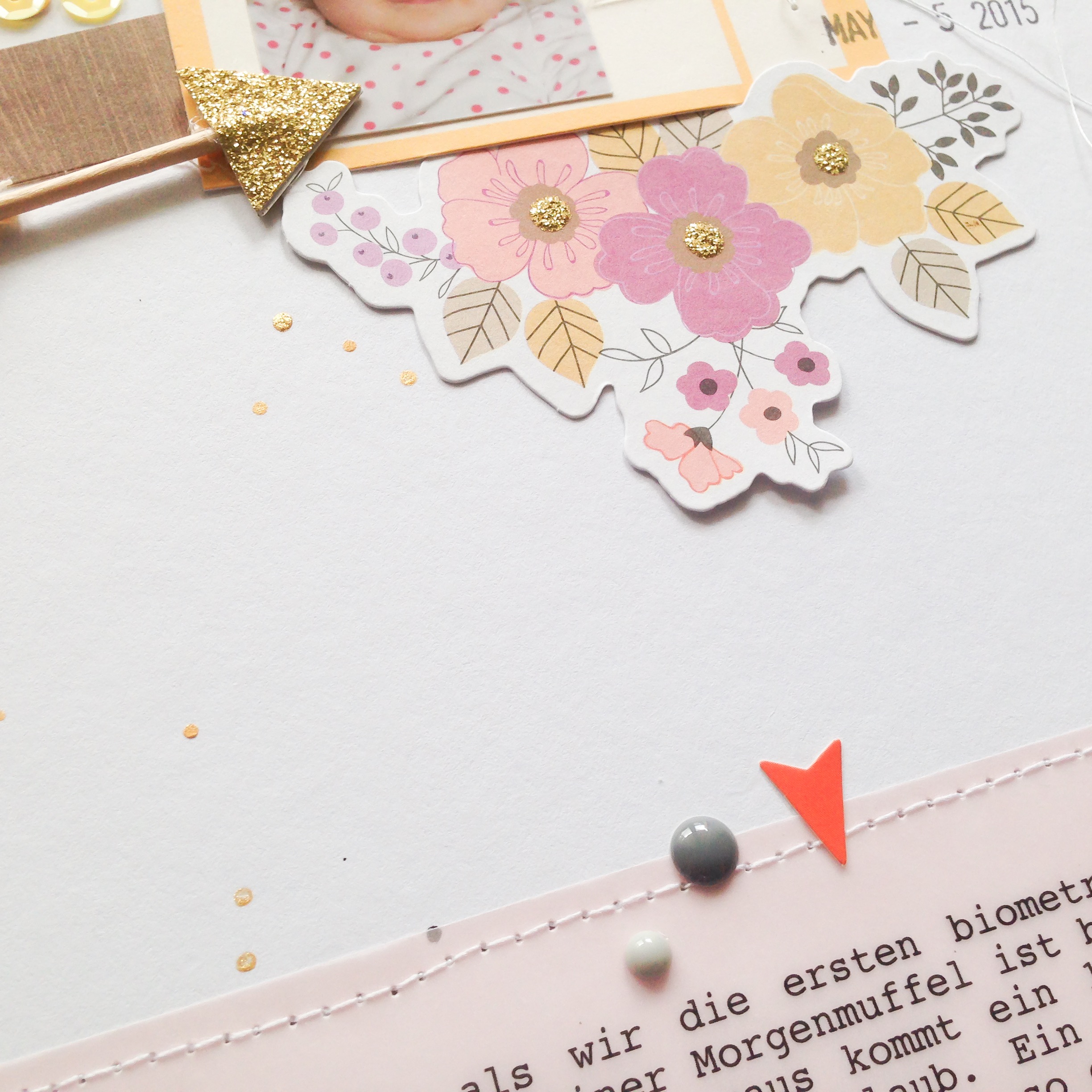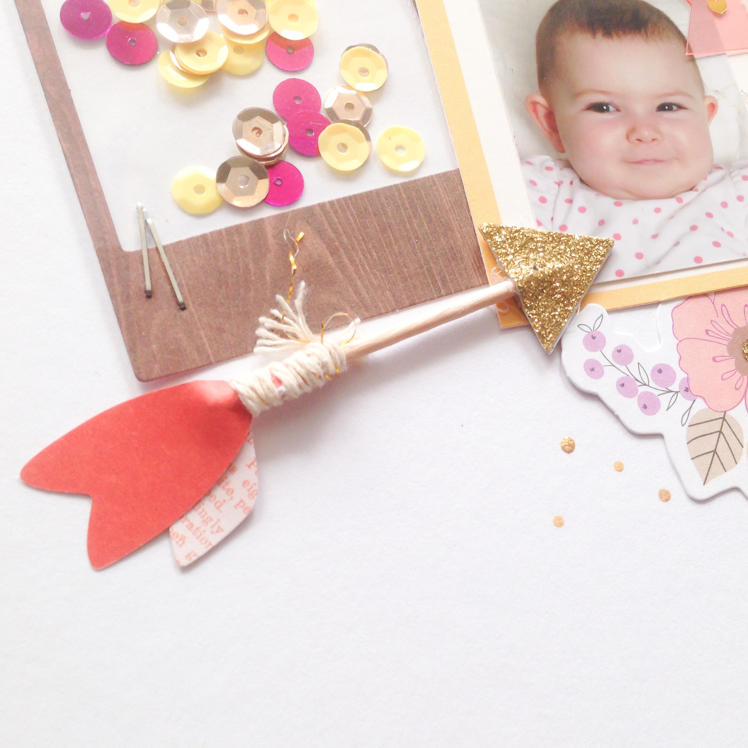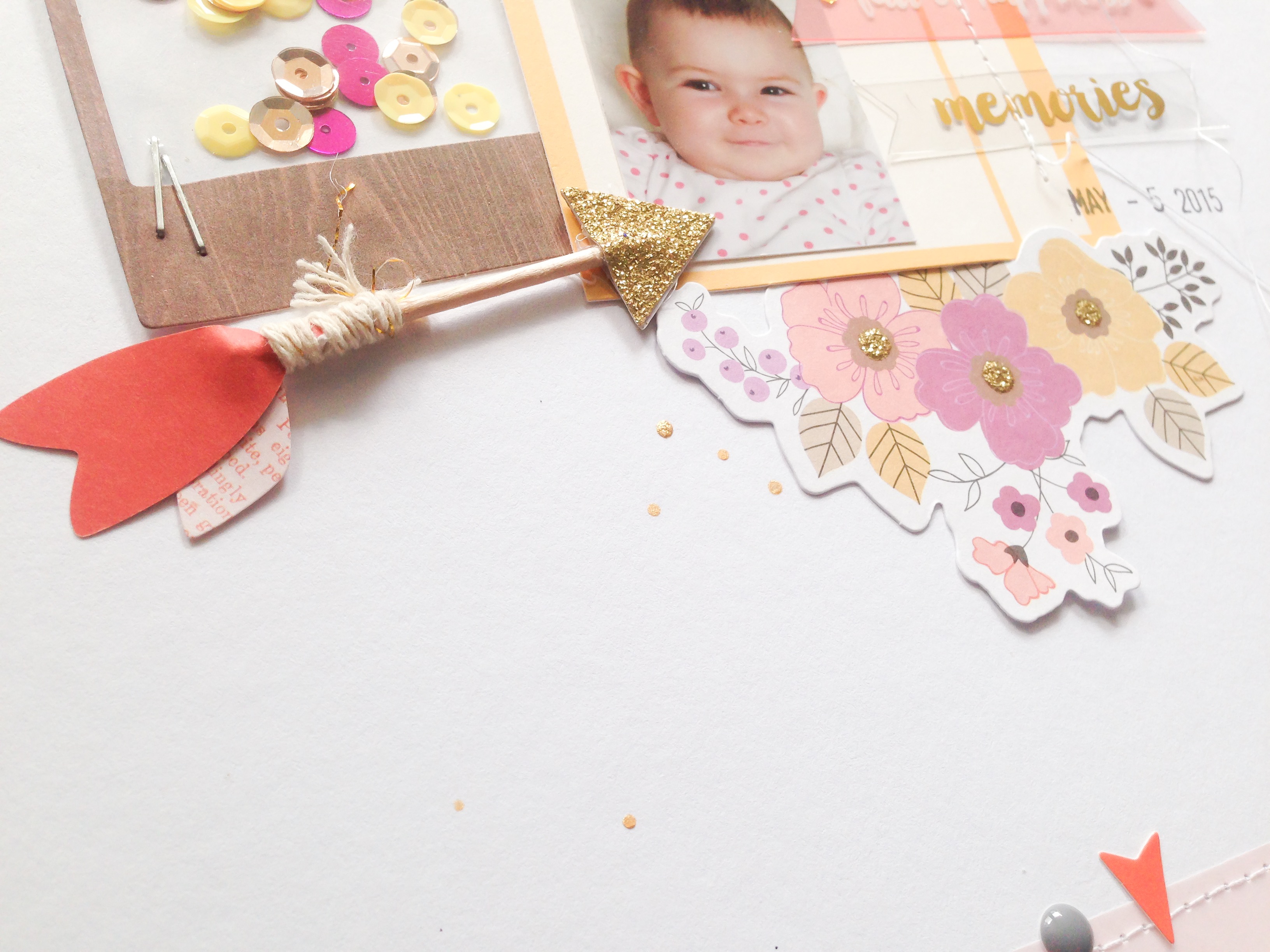 Ich mag die Farbkombination des Layouts total gerne und die durchsichtigen Ephemera Words der Cedar Lane Kollektion von Pink Paislee. Und natürlich auch diesen wunderschönen Pfeil mit goldfarbener Spitze.