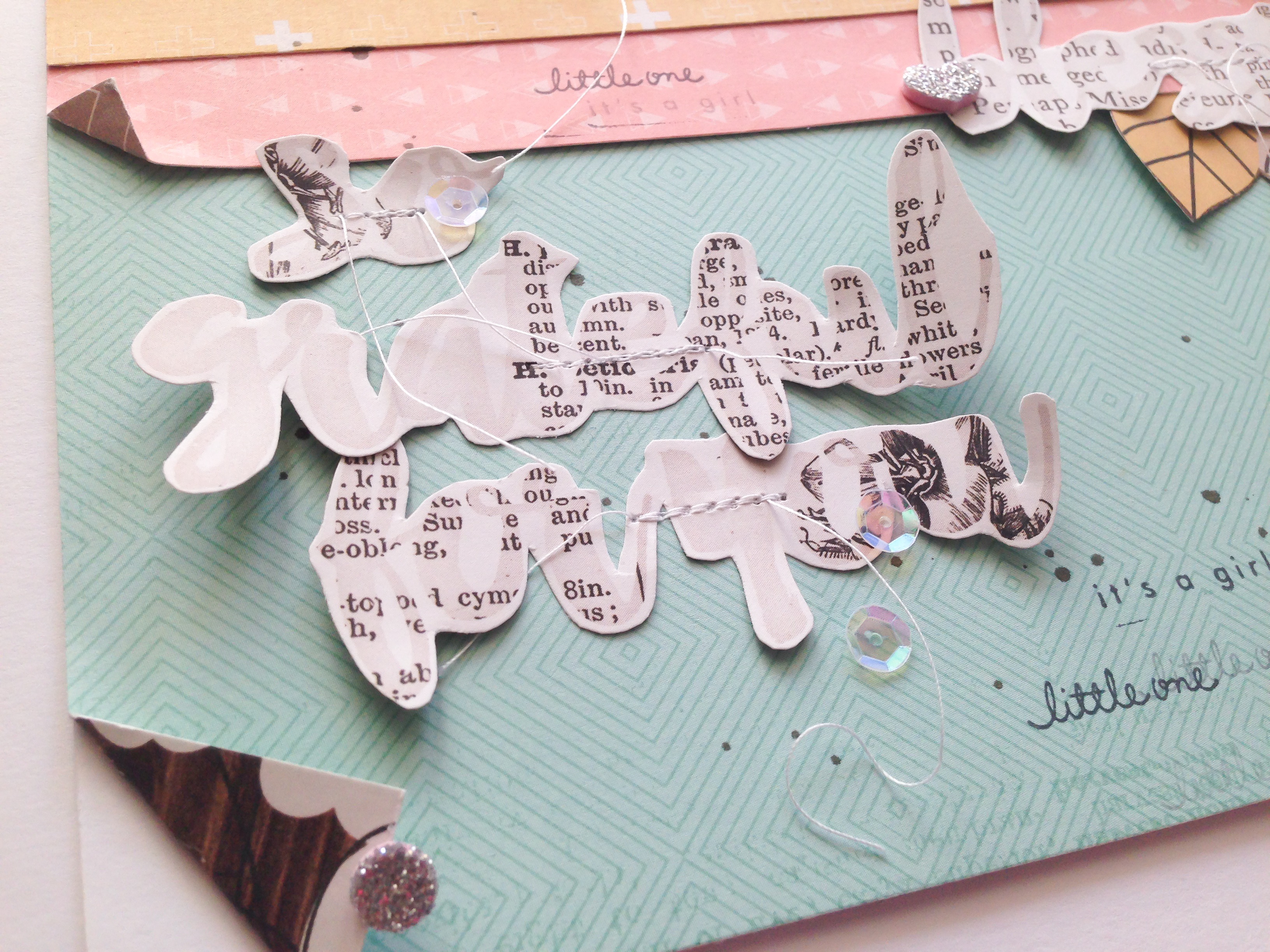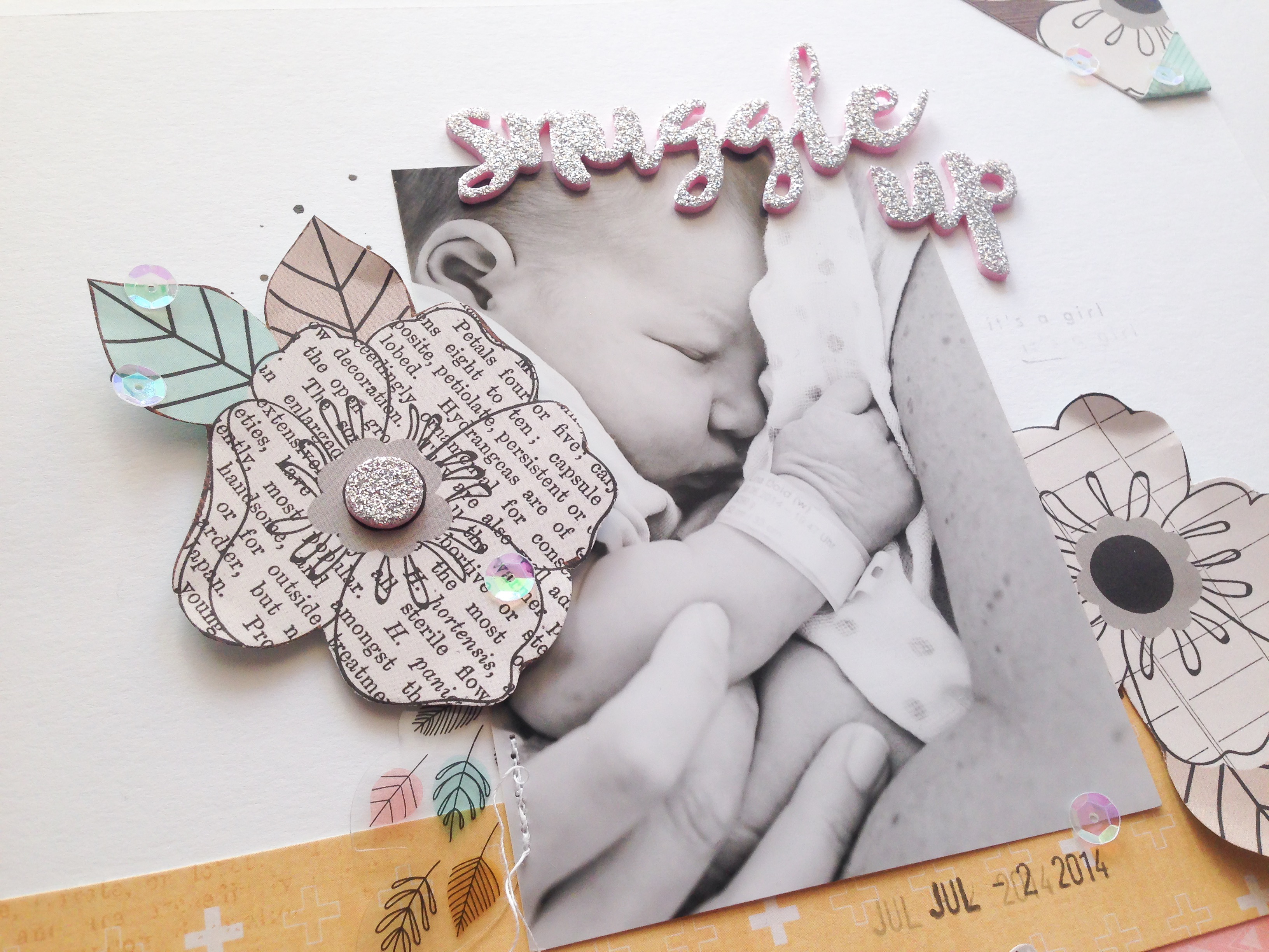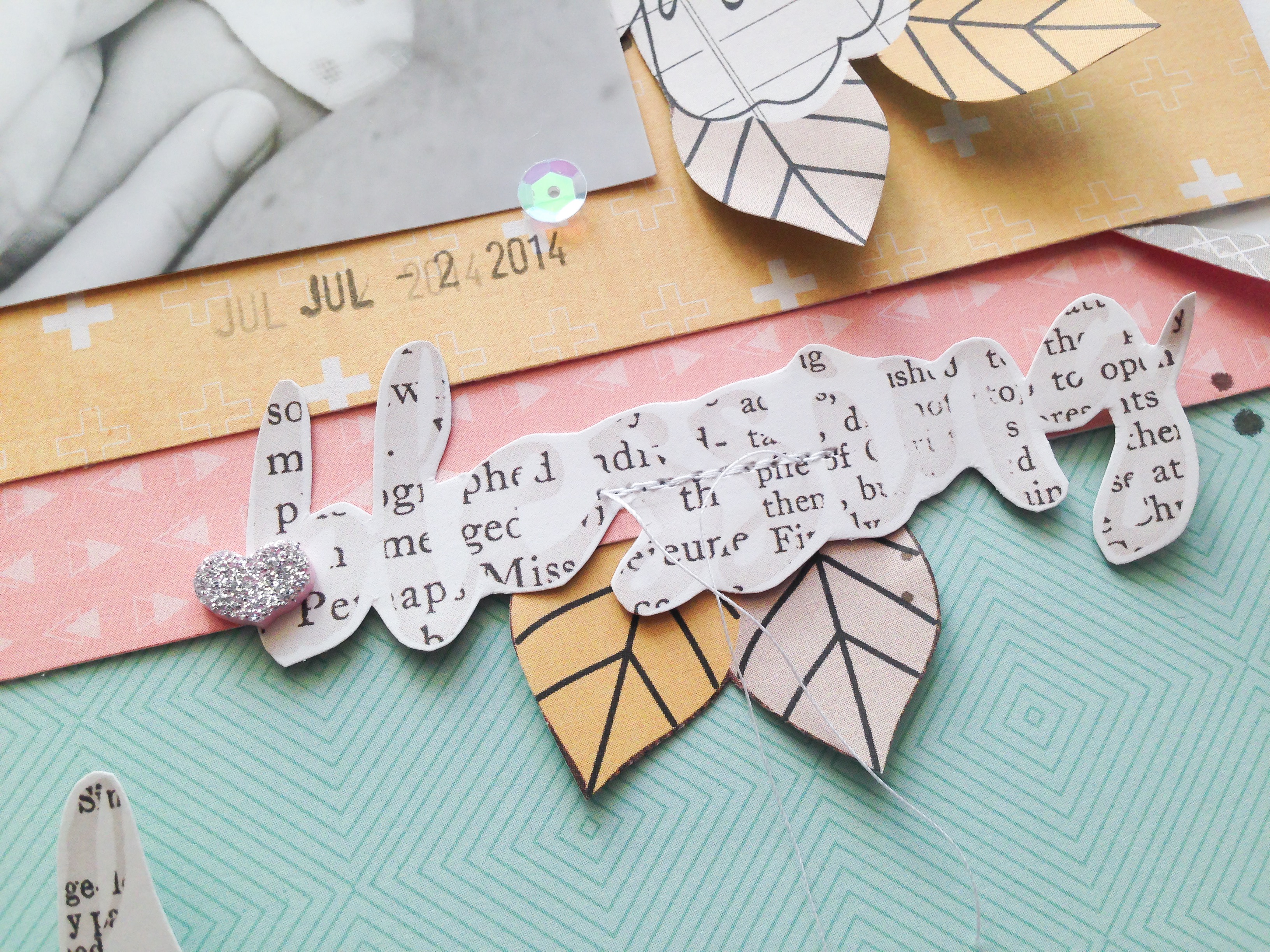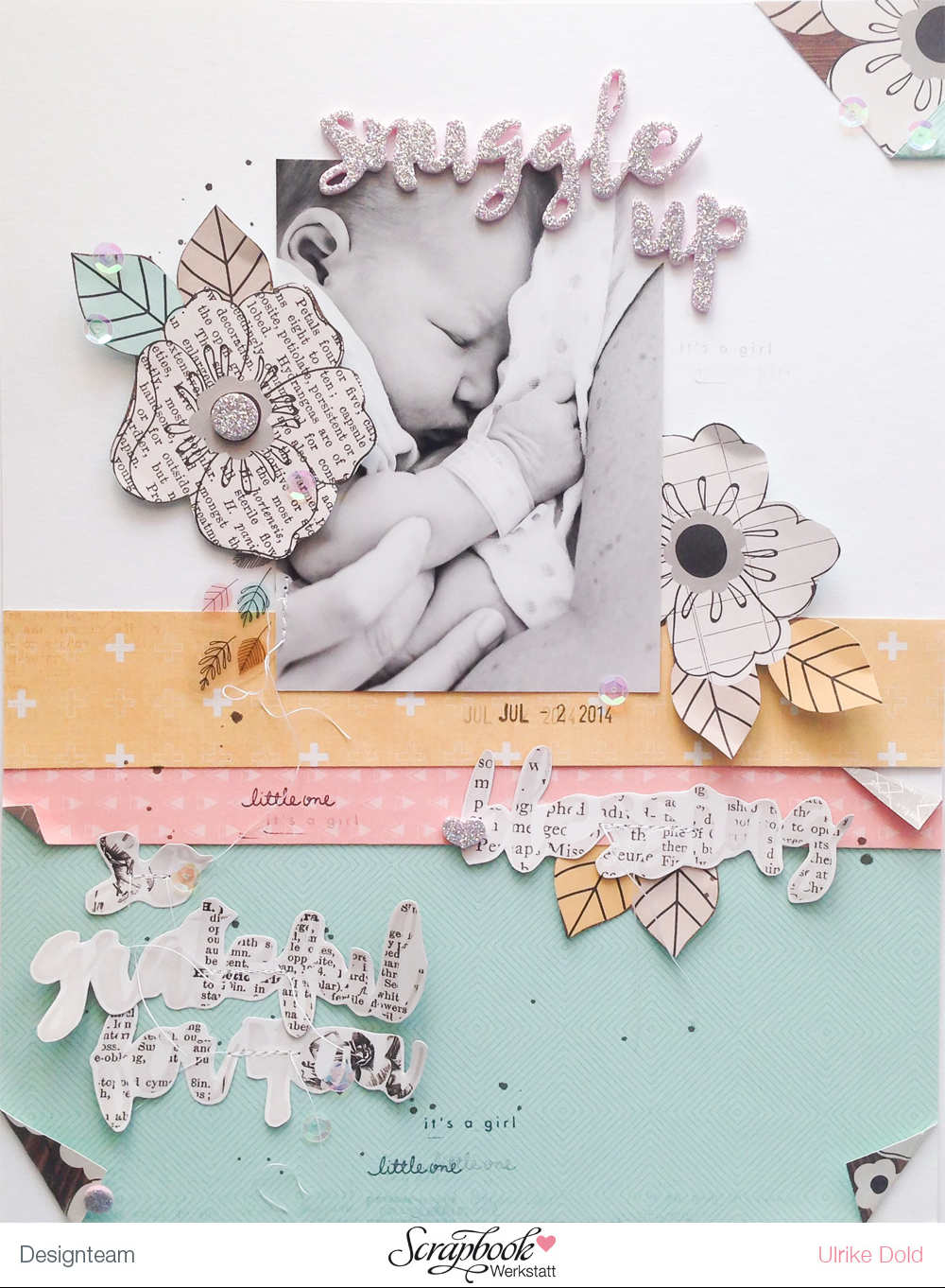 Für das Layout habe ich die Blüten und zwei der Schriftzüge aus den Designpapieren ausgeschnitten und auf mein Layout aufgeklebt und aufgenäht. Der Titel ist ein Gitter Foam Sticker. Wenn ihr genau schaut seht ihr, dass dieser noch mit einem hellen Rosa-Ton hinterlegt ist… superschön! Zur Zeit knicke ich unheimlich gerne auch Ecken von Papieren um. Das ist euch sicher schon aufgefallen. Hier habe ich es auch mal wieder gemacht.