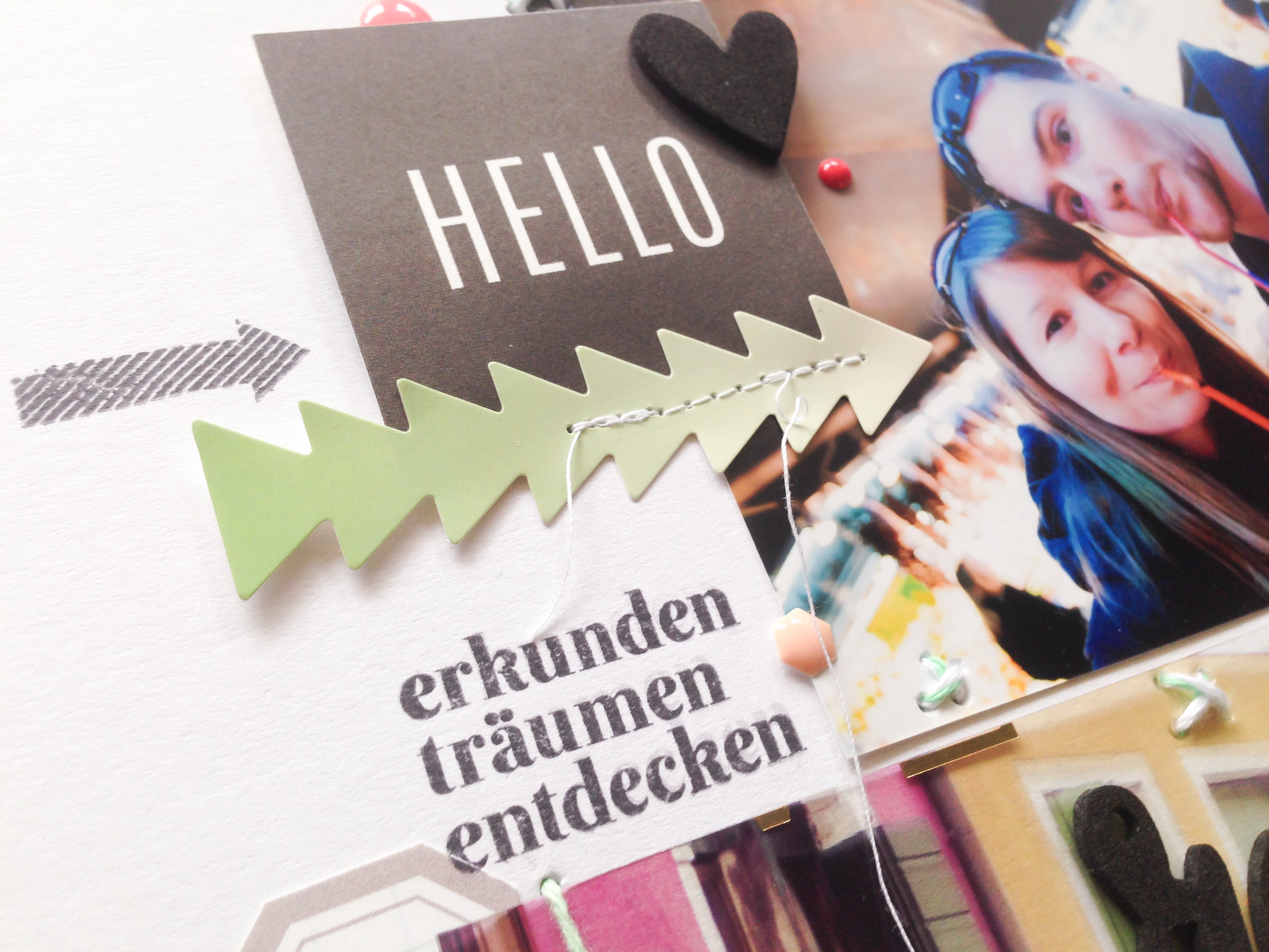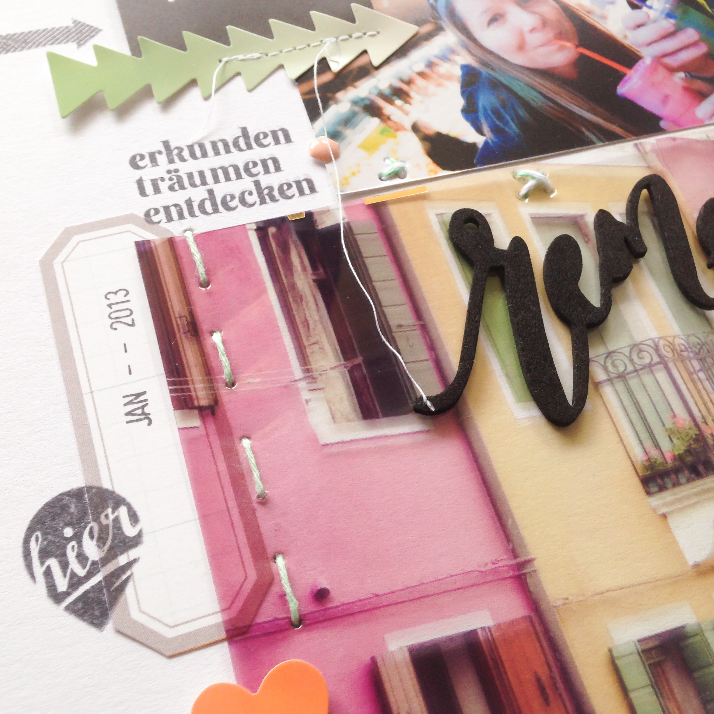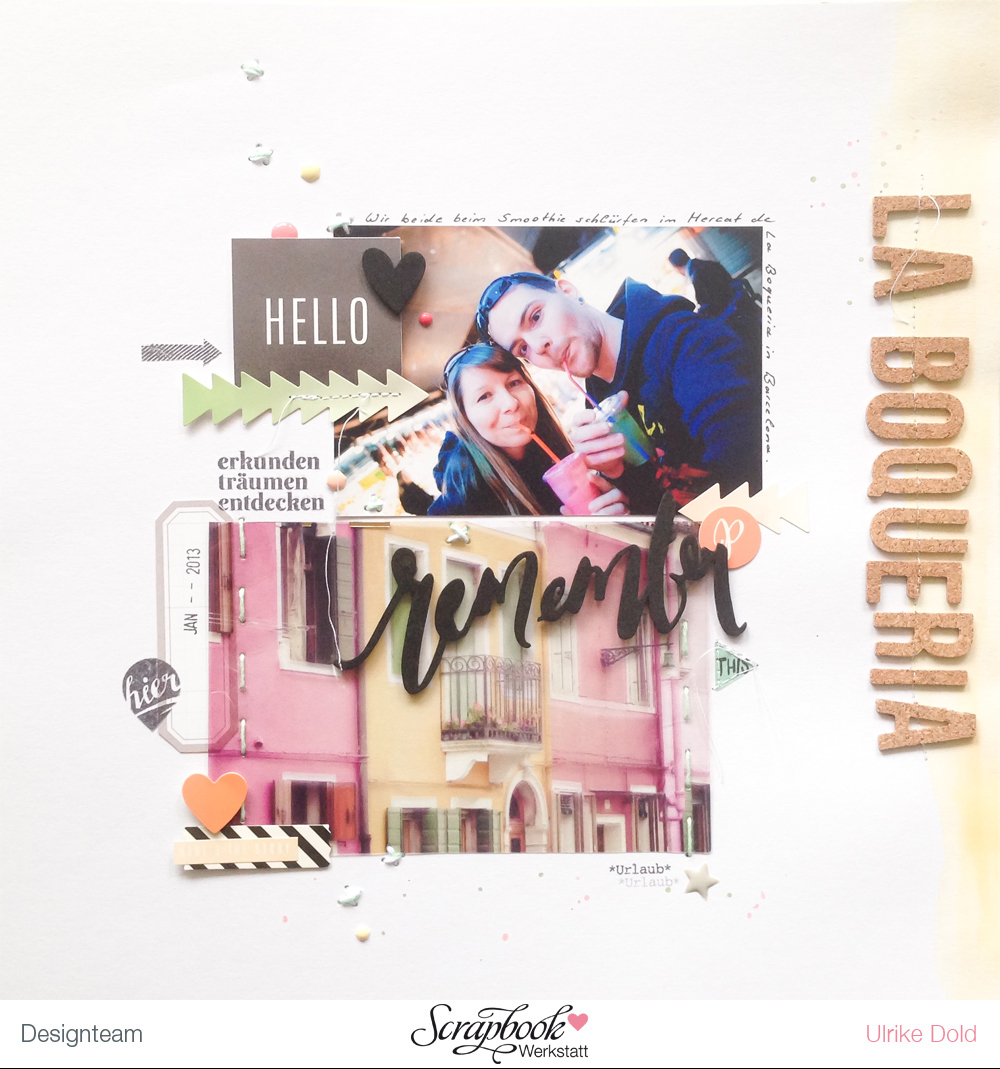 Zum Einsatz kamen auch mal wieder meine Wasserfarben und etwas Garn. Denn ich habe das Acetat auf das Layout gestickt. Zudem habe ich die Momentstempel „Fernweh“ von Papier Projekt verwendet. Die haben so perfekt dazu gepasst. Für den Titel habe ich die tollen Kork Alpha Sticker von Dear Lizzy Documentary benutzt. Noch ein paar Sticker von DIY Home von Pebbles und die Foam Word Sticker von Dear Lizzy Documentary und dann war es auch schon fertig.
