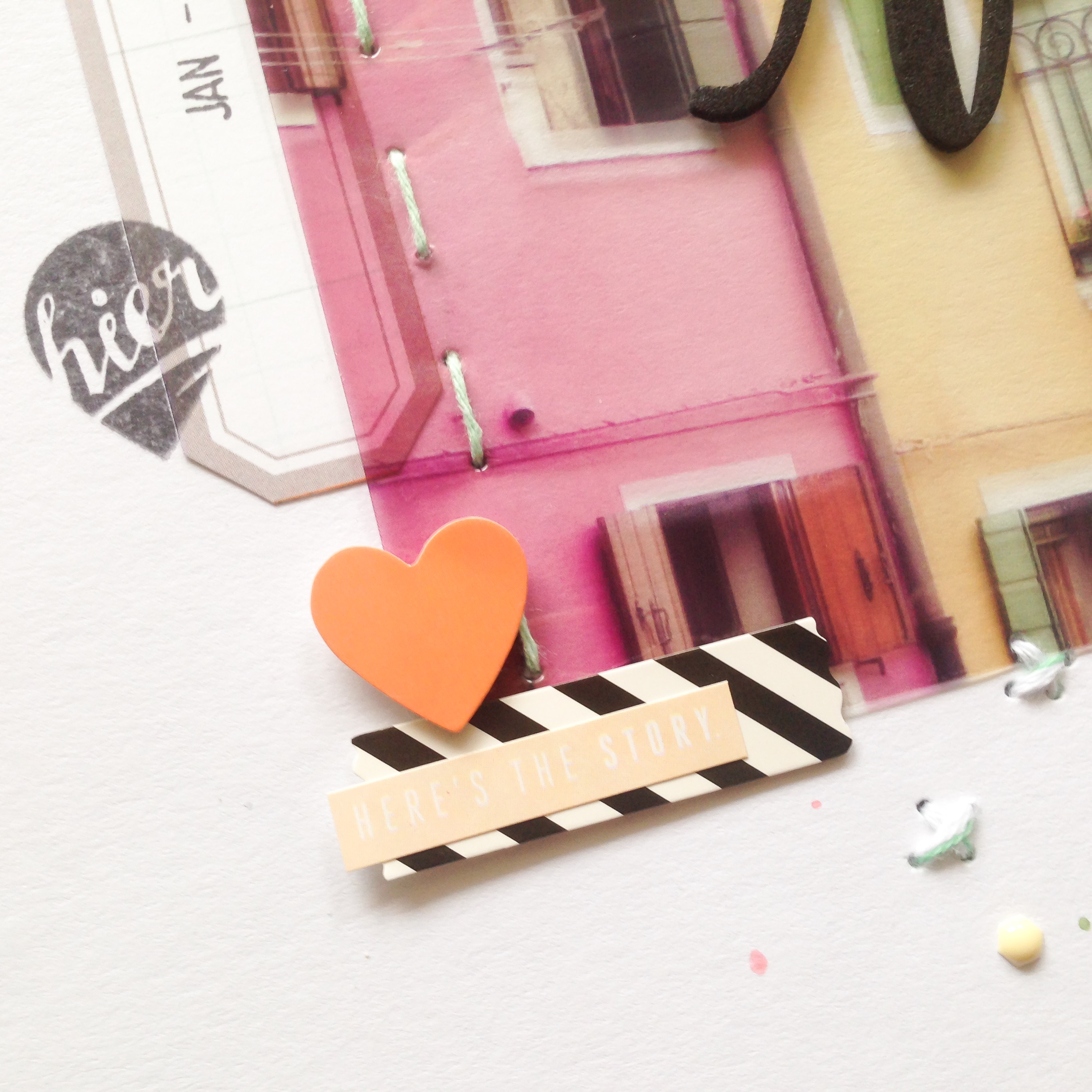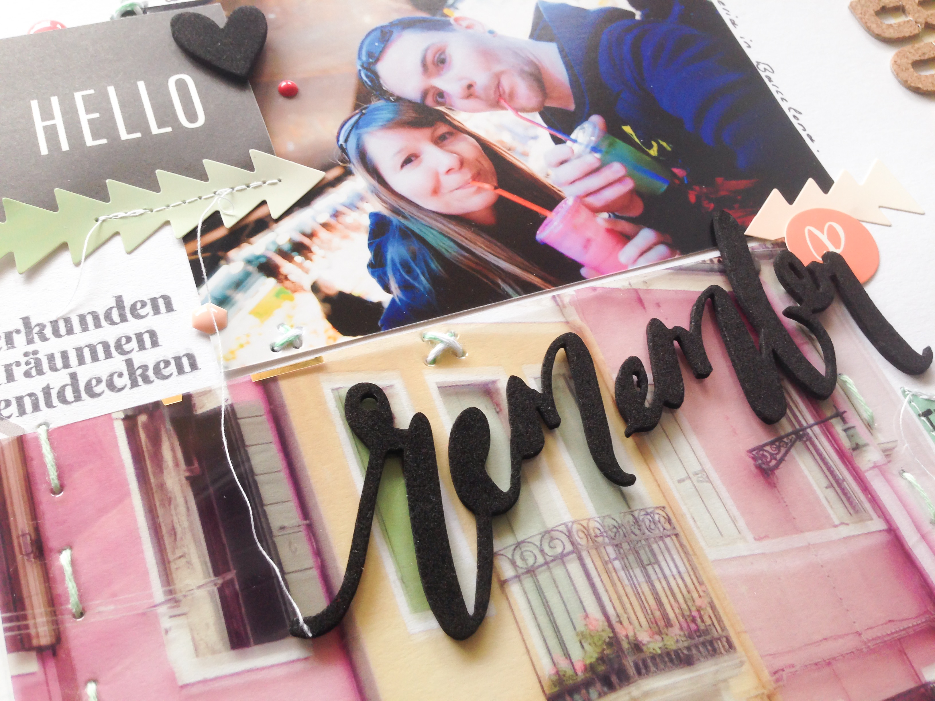 Im Kit ist ein wunderschönes Acetat-Papier von Pink Paislee Memorandum dabei und als ich es gesehen habe, hatte ich sofort ein Layout mit einem Barcelonafoto im Kopf. Gesagt, getan.