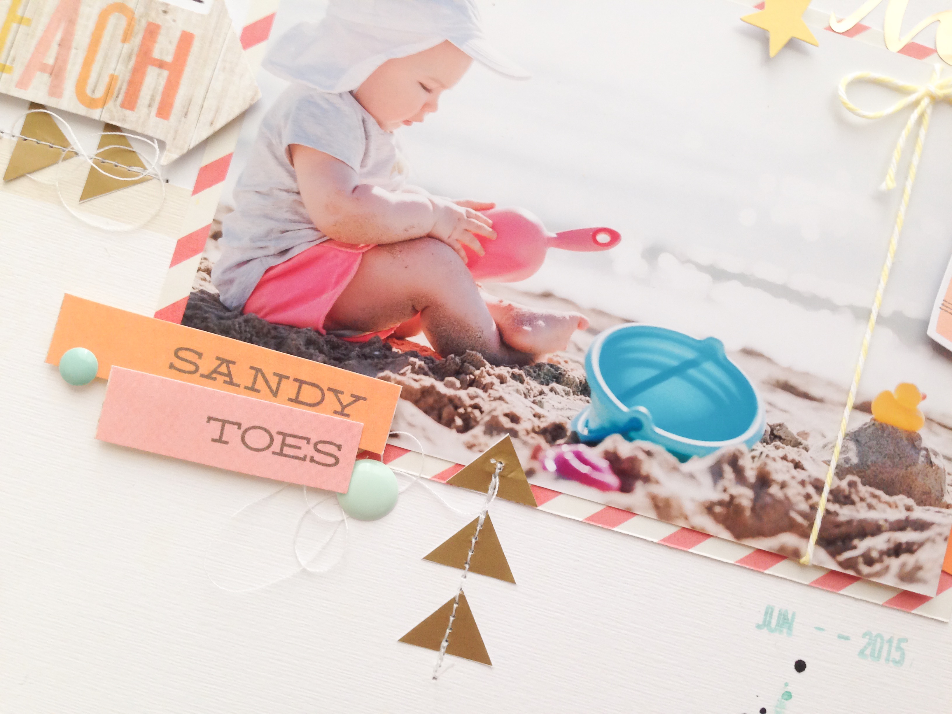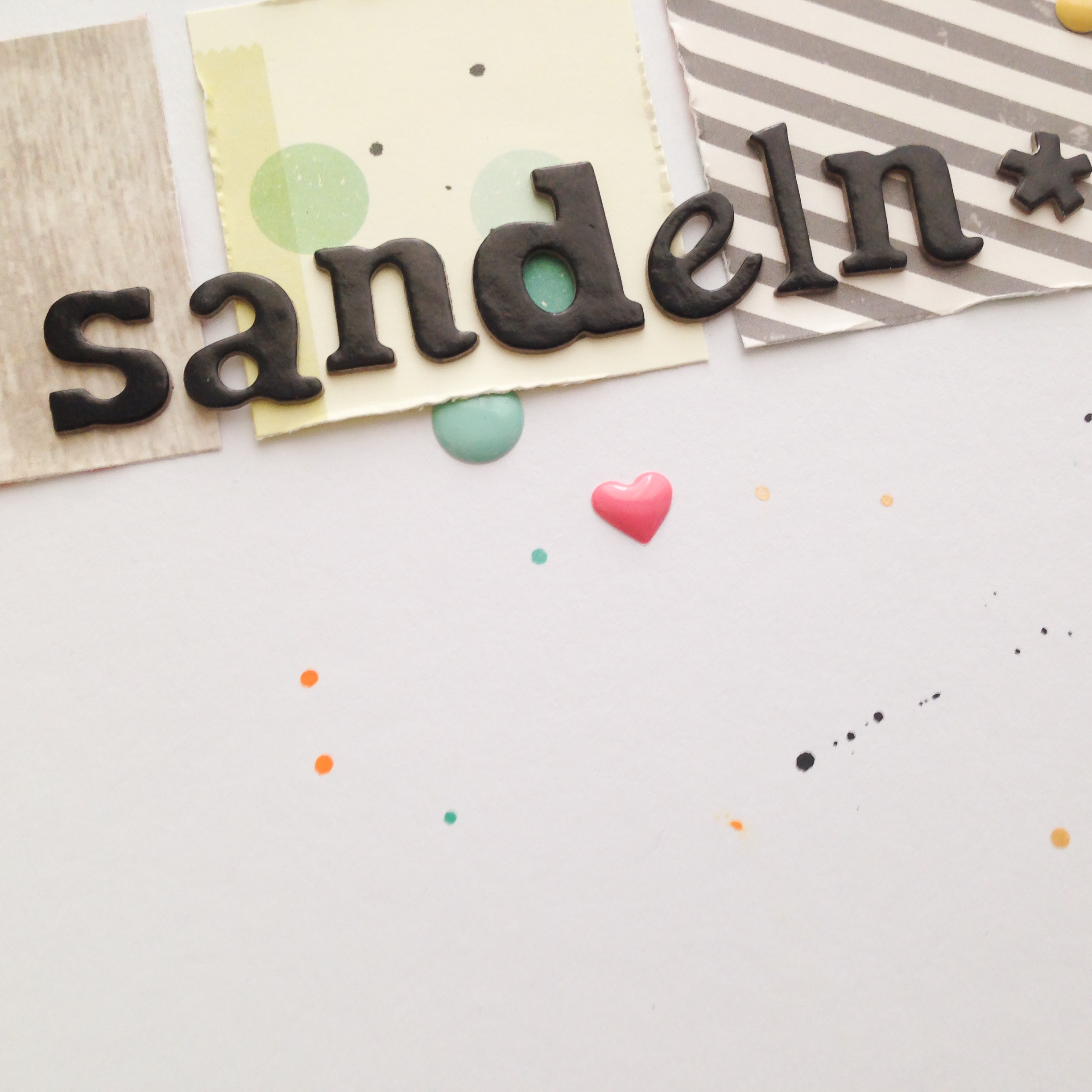 Es ist ein Layout über das 1. Mal „Sandeln“ geworden. Den ersten Kontakt mit Sand hatte Lina am Playa del Muro auf Mallorca, und das wollte ich auf jeden Fall in einem Layout festhalten. Die sommerlichen und bunten Papiere haben sich super dafür angeboten. Die goldenen Pfeile habe ich aus einer der im Kit enthaltenen Project Life Karten ausgeschnitten und aufgenäht. Und das ist das gute Stück.